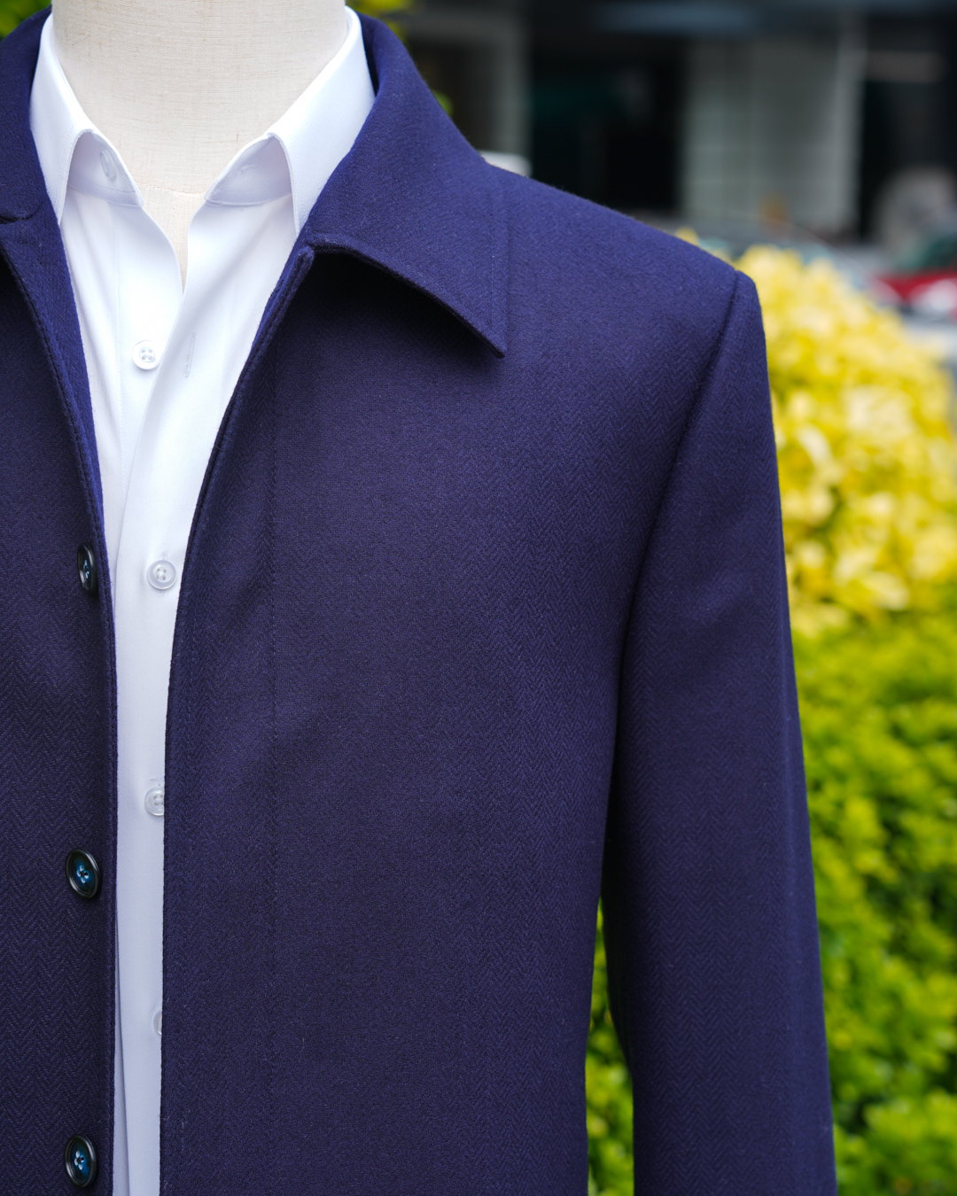 Dark Blue Herringbone Virgin Wool Raglan Overcoat